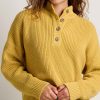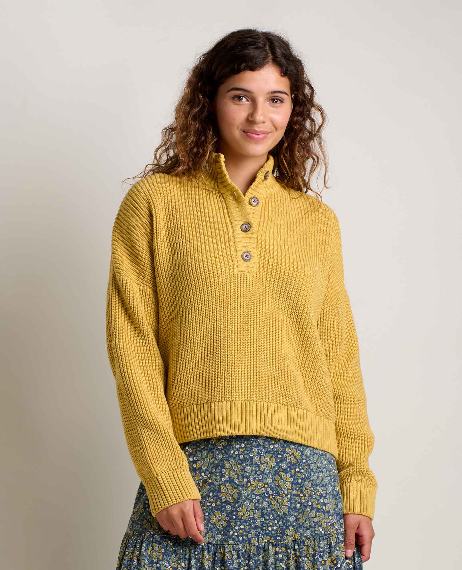Features: Shaker stitch, henley, rib collar, cuffs, and hem