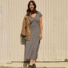 Fit: A-line silhouette, v-neck, double layer bodice, back waist tie, midi length, 48.5 inch length