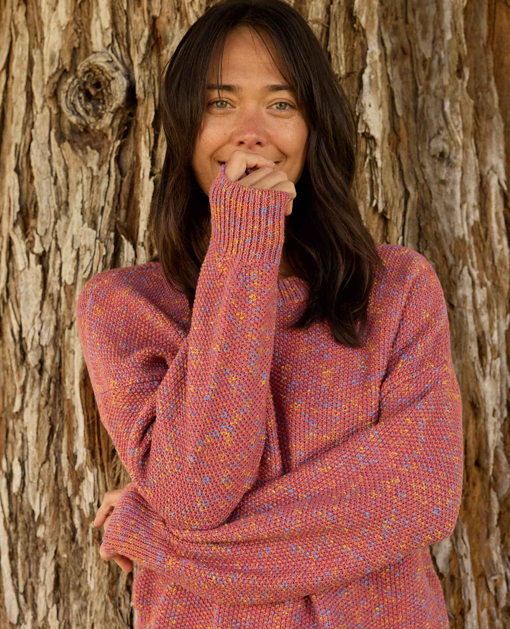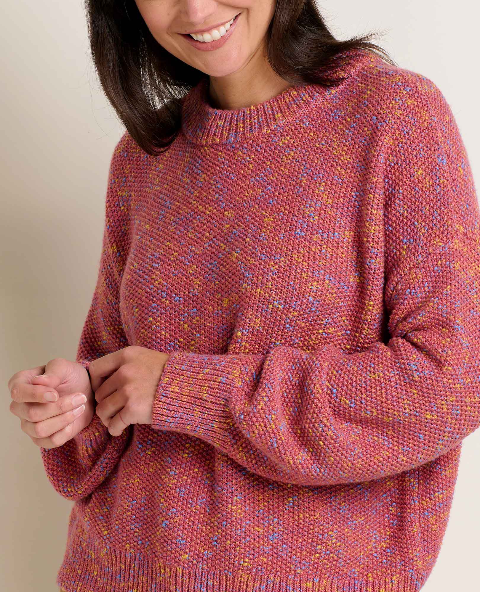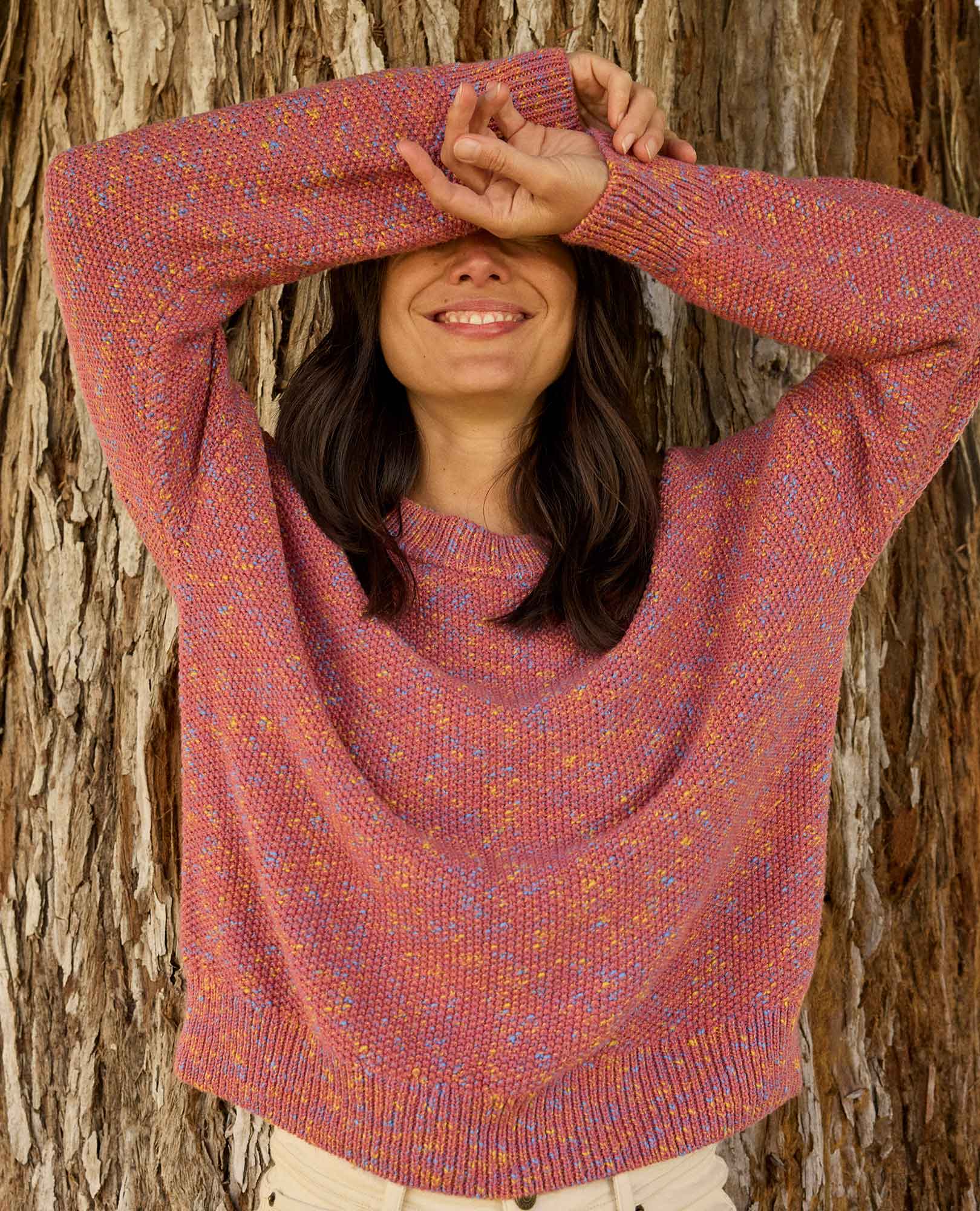 Features: Seed stitch, rib neck, cuffs, and hem